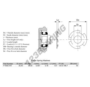 Il Rondelle Per Cuscinetti A Sfera con riferimento F1555-018 ha un diametro interno di 25.4 mm, un diametro esterno di 39.5 mm e uno spessore di 0.457 mm.
