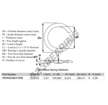 Il Rondelle Per Molle Ondulate Divise con riferimento SWSW-280.01-259.16-0.81-9 ha un diametro interno di 259.16 mm e uno spessore di 0.81 mm. È realizzato in materiale ACCIAIO.