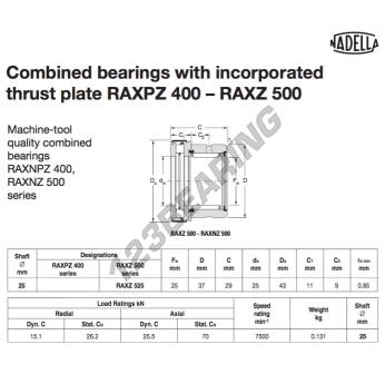 Il Altri Cuscinetti, noto come RAXZ525-NADELLA NADELLA, ha un diametro interno di 25 mm, un diametro esterno di 43 mm e uno spessore di 29 mm.