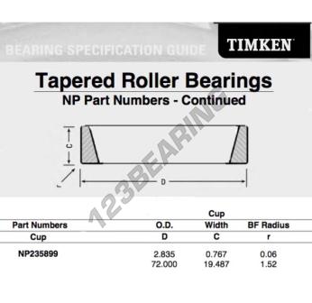 Il Cassa, noto come NP235899-TIMKEN TIMKEN, ha un diametro interno di mm, un diametro esterno di 72 mm e uno spessore di 19.487 mm.