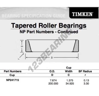 Il Cassa, noto come NP241715-TIMKEN TIMKEN, ha un diametro interno di mm, un diametro esterno di 200 mm e uno spessore di 34.925 mm.