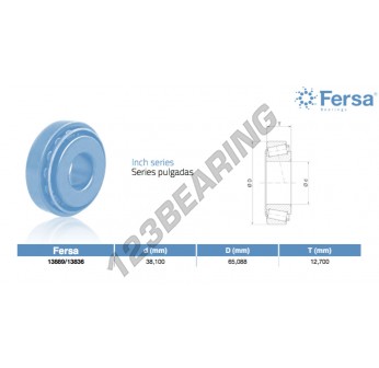 Il Cuscinetto Conico, noto come 13889-13836-ASFERSA ASFERSA, ha un diametro interno di 38.1 mm, un diametro esterno di 65.088 mm e uno spessore di 12.7 mm.