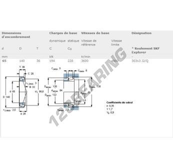 Il Cuscinetto Conico, noto come 30313-SKF SKF, ha un diametro interno di 65 mm, un diametro esterno di 140 mm e uno spessore di 36 mm.