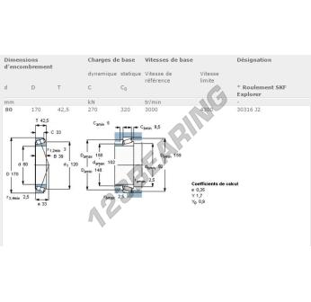 Il Cuscinetto Conico, noto come 30316-J2-SKF SKF, ha un diametro interno di 80 mm, un diametro esterno di 170 mm e uno spessore di 42.5 mm.