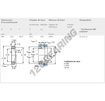 Il Cuscinetto Conico, noto come 31319-J2-SKF SKF, ha un diametro interno di 95 mm, un diametro esterno di 200 mm e uno spessore di 49.5 mm.