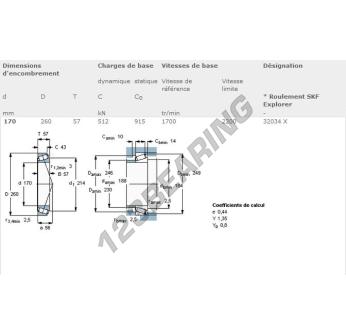 Il Cuscinetto Conico, noto come 32034X-SKF SKF, ha un diametro interno di 170 mm, un diametro esterno di 260 mm e uno spessore di 57 mm.