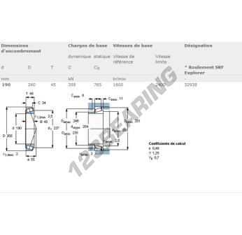 Il Cuscinetto Conico, noto come 32938-SKF SKF, ha un diametro interno di 190 mm, un diametro esterno di 260 mm e uno spessore di 45 mm.