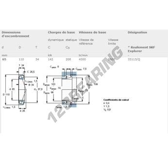 Il Cuscinetto Conico, noto come 33113-SKF SKF, ha un diametro interno di 65 mm, un diametro esterno di 110 mm e uno spessore di 34 mm.