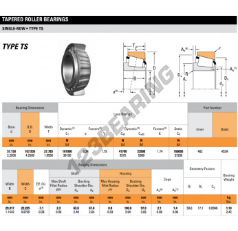 Il Cuscinetto Conico, noto come 462-453A-TIMKEN TIMKEN, ha un diametro interno di 57.15 mm, un diametro esterno di 107.95 mm e uno spessore di 27.783 mm.