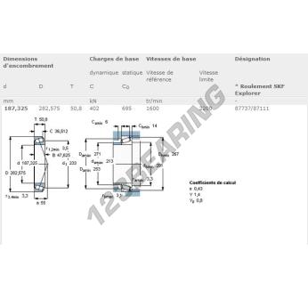 Il Cuscinetto Conico, noto come 87737-87111-SKF SKF, ha un diametro interno di 187.33 mm, un diametro esterno di 282.58 mm e uno spessore di 50.8 mm.