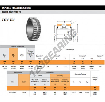 Il Cuscinetto Conico, noto come EE127094D-127138-TIMKEN TIMKEN, ha un diametro interno di 241.225 mm, un diametro esterno di 355.498 mm e uno spessore di 107.95 mm.