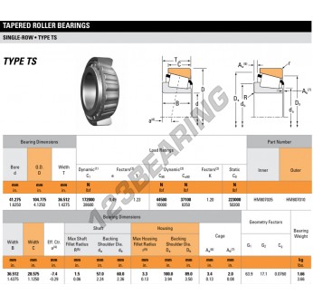 Il Cuscinetto Conico, noto come HM807035-HM807010-TIMKEN TIMKEN, ha un diametro interno di 41.275 mm, un diametro esterno di 104.775 mm e uno spessore di 36.512 mm.