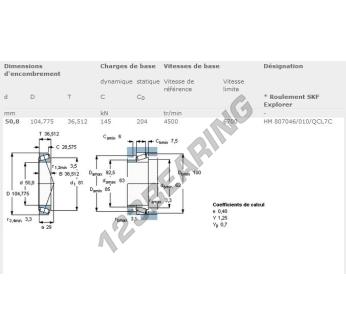 Il Cuscinetto Conico, noto come HM807046-HM804010-QCL7C-SKF SKF, ha un diametro interno di 50.8 mm, un diametro esterno di 104.78 mm e uno spessore di 36.51 mm.