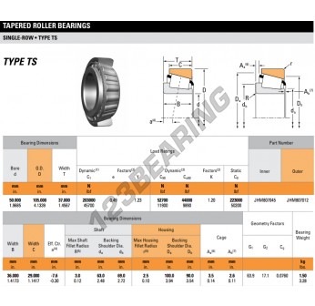 Il Cuscinetto Conico, noto come JHM807045-JHM807012-TIMKEN TIMKEN, ha un diametro interno di 50 mm, un diametro esterno di 105 mm e uno spessore di 37 mm.