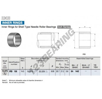 Il Boccole Interne conosciuto con il riferimento IRB106-IKO IKO ha un diametro interno di 15.875 mm, un diametro esterno di 22.225 mm e una lunghezza di 9.9 mm. È prodotto in .