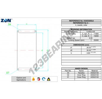 Il Gruppi Rullini E Gabbia, noto come K26-30-9.80-ZEN ZEN, ha un diametro interno di 26 mm, un diametro esterno di 30 mm e uno spessore di 9.8 mm.