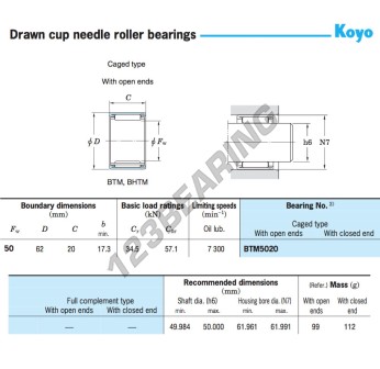 Il Cuscinetti A Rullini, noto come BTM5020-JTEKT JTEKT, ha un diametro interno di 50 mm, un diametro esterno di 62 mm e uno spessore di 20 mm.