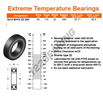 Il Cuscinetto A Sfera - Alta Temperatura, noto come 6212-ZZ-BHTS280 Generico, ha un diametro interno di 62 mm, un diametro esterno di 110 mm e uno spessore di 22 mm.