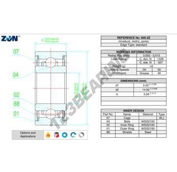 Il Cuscinetti A Sfera, noto come 605-2Z-ZEN ZEN, ha un diametro interno di 5 mm, un diametro esterno di 14 mm e uno spessore di 5 mm.