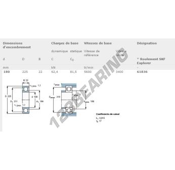 Il Cuscinetti A Sfera, noto come 61836-SKF SKF, ha un diametro interno di 180 mm, un diametro esterno di 225 mm e uno spessore di 22 mm.