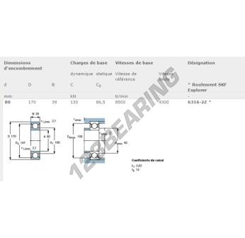Il Cuscinetti A Sfera, noto come 6316-ZZ-SKF SKF, ha un diametro interno di 80 mm, un diametro esterno di 170 mm e uno spessore di 39 mm.