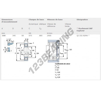 Il Cuscinetti A Sfera, noto come QJ332-N2MA-SKF SKF, ha un diametro interno di 160 mm, un diametro esterno di 340 mm e uno spessore di 68 mm.