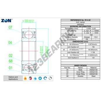 Il Cuscinetti A Sfera, noto come R14-2Z-ZEN ZEN, ha un diametro interno di 22.2 mm, un diametro esterno di 47.6 mm e uno spessore di 12.7 mm.
