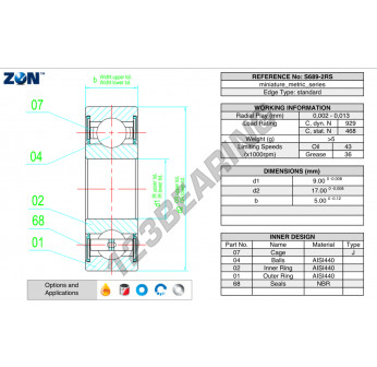 Il Cuscinetti A Sfera, noto come S689-2RS-ZEN ZEN, ha un diametro interno di 9 mm, un diametro esterno di 17 mm e uno spessore di 5 mm.
