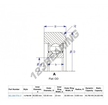 Il Cuscinetti Di Guida, noto come MG308-FFN-17-ENDURO ENDURO, ha un diametro interno di 40 mm, un diametro esterno di 123.5 mm e uno spessore di 32 mm.