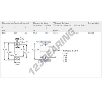 Il Cuscinetti Orientabili A Sfere, noto come 13030-SKF SKF, ha un diametro interno di 150 mm, un diametro esterno di 225 mm e uno spessore di 56 mm.