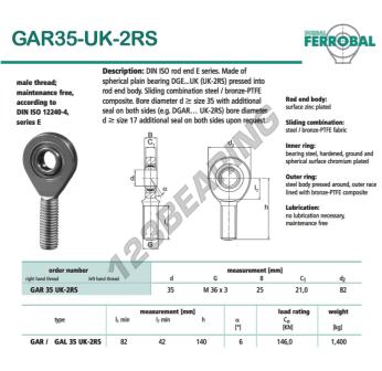 Il Giunti Sferici Ge noto come GAR35-UK-2RS-DURBAL DURBAL ha un diametro interno di 35 mm, un diametro esterno di 82 mm e uno spessore di 25 mm.