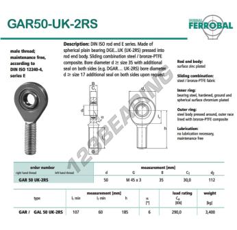 Il Giunti Sferici Ge noto come GAR50-UK-2RS-DURBAL DURBAL ha un diametro interno di 50 mm, un diametro esterno di 112 mm e uno spessore di 35 mm.