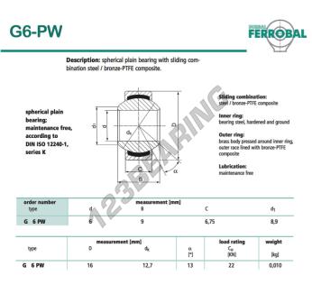 Il Giunti Sferici Geew noto come G6-PW-DURBAL DURBAL ha un diametro interno di 6 mm, un diametro esterno di 16 mm e uno spessore di 6.75 mm.