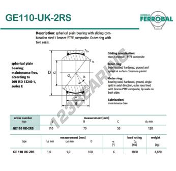 Il Giunti Sferici Geew noto come GE110-UK-2RS-DURBAL DURBAL ha un diametro interno di 110 mm, un diametro esterno di 160 mm e uno spessore di 55 mm.