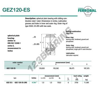 Il Giunti Sferici Geew noto come GEZ120-ES-DURBAL DURBAL ha un diametro interno di 120.65 mm, un diametro esterno di 187.325 mm e uno spessore di 90.475 mm.