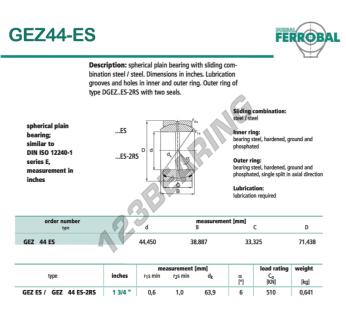 Il Giunti Sferici Geew noto come GEZ44-ES-DURBAL DURBAL ha un diametro interno di 44.45 mm, un diametro esterno di 71.438 mm e uno spessore di 33.325 mm.