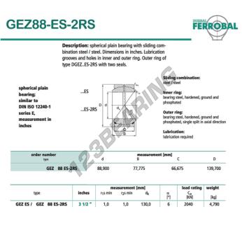 Il Giunti Sferici Geew noto come GEZ88-ES-2RS-DURBAL DURBAL ha un diametro interno di 88.9 mm, un diametro esterno di 139.7 mm e uno spessore di 66.675 mm.