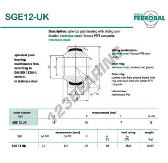 Il Giunti Sferici Geew noto come SGE12-UK-DURBAL DURBAL ha un diametro interno di 12 mm, un diametro esterno di 22 mm e uno spessore di 7 mm.