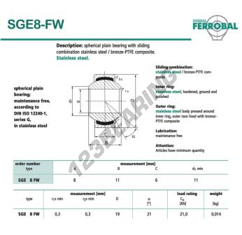 Il Giunti Sferici Geew noto come SGE8-FW-DURBAL DURBAL ha un diametro interno di 8 mm, un diametro esterno di 19 mm e uno spessore di 6 mm.