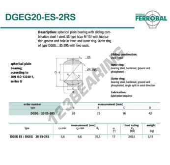 Il Giunti Sferici Geg noto come GEG20-ES-2RS-DURBAL DURBAL ha un diametro interno di 20 mm, un diametro esterno di 42 mm e uno spessore di 16 mm.