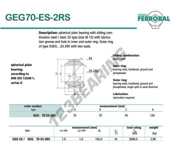 Il Giunti Sferici Geg noto come GEG70-ES-2RS-DURBAL DURBAL ha un diametro interno di 70 mm, un diametro esterno di 120 mm e uno spessore di 45 mm.