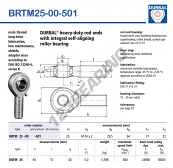 Il Giunti Sferici Sa noto come BRTM25-00-501-DURBAL DURBAL ha un passo della vite di , un diametro interno di 25 mm, un diametro esterno di 64 mm e uno spessore di 31 mm.