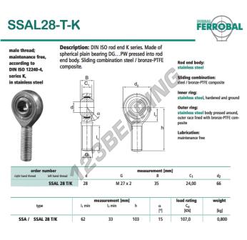 Il Giunti Sferici Sa noto come DSSAL28-T-K-DURBAL DURBAL ha un passo della vite di , un diametro interno di 28 mm, un diametro esterno di 66 mm e uno spessore di 35 mm.