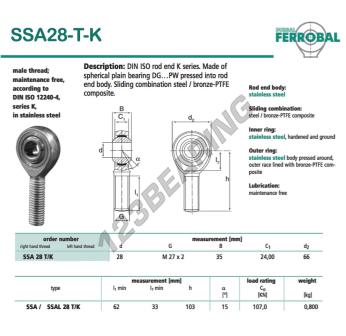 Il Giunti Sferici Sa noto come SSA28-T-K-DURBAL DURBAL ha un passo della vite di , un diametro interno di 28 mm, un diametro esterno di 66 mm e uno spessore di 35 mm.