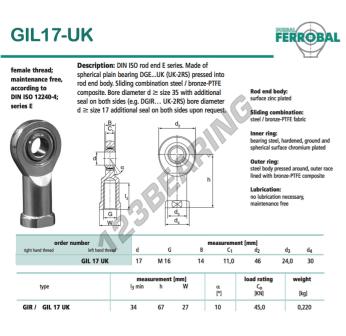 Il Giunti Sferici Si noto come GIL17-UK-DURBAL DURBAL ha un diametro interno di 17 mm, un diametro esterno di 46 mm e uno spessore di 14 mm.