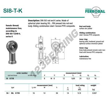 Il Giunti Sferici Si noto come SI8-T-K-DURBAL DURBAL ha un diametro interno di 8 mm, un diametro esterno di 24 mm e uno spessore di 12 mm.