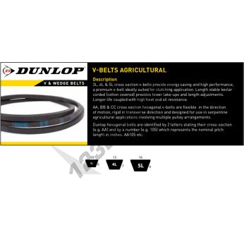 La cinghia di distribuzione 4L350K-DUNLOP appartente alla famiglia dei Cinghie Trapezoidali Classiche, del marchio DUNLOP, con profilo 4L. Presenta una sezione 12.70mm x 9mm una lunghezza interna di 839 mm, una lunghezza esterna di 889 mm, e una lunghezza primitiva di mm.